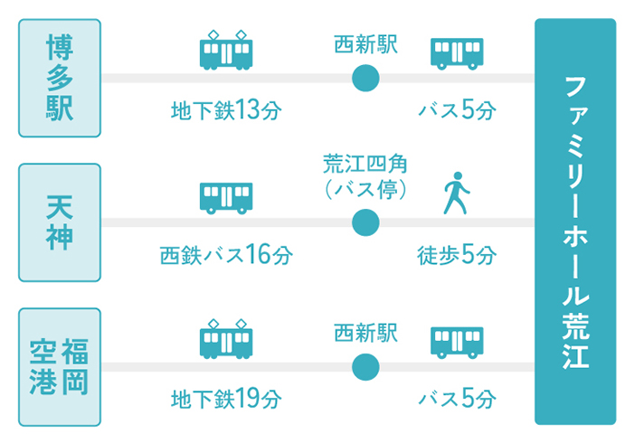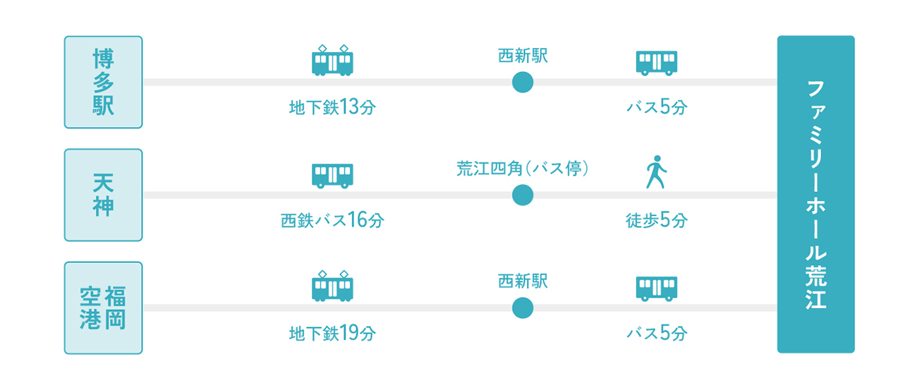 お葬式・家族葬の天国社【ファミリーホール荒江】(福岡市早良区)は、西新駅からタクシーやバスで約10分のところに位置する福岡市早良区にある天国社グループの葬儀会館になります。