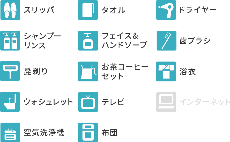 - 浴衣/バスタオル、フェイスタオル/歯ブラシ/ボディースポンジ/綿棒セット/ドライヤー/ボディーソープ/洗顔/シャンプー/リンス