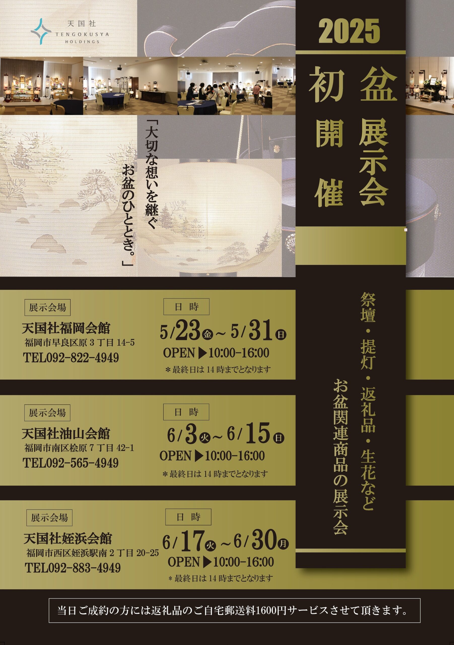 天国社からのお知らせ 福岡の葬儀社「天国社」 天国社からのお知らせ イベント情報 初盆展示会開催 初盆展示会開催 2025.04.11 イベント情報 天国社初盆展示会のお知らせです。 祭壇 提灯 返礼品 生花などお盆関連商品の展示会となっております。 当日、ご成約の方には返礼品のご自宅郵送料(1600円)サービスの特典あり! 開催会館はこちら!! ・福岡会館 ・油山会館 ・姪浜会館 日にち・時間の詳細はぜひ、チラシをご確認ください。 些細と思われる事も、お気軽にご連絡ください。 24時間365日対応・通話無料 電話をかける メールでご相談 無料資料請求 戻る カテゴリー 新着情報 お知らせ イベント情報 葬儀の知識 福岡の葬儀情報 家族葬について お客様の声 ご葬儀事例一覧 年別アーカイブ 2025年 2024年