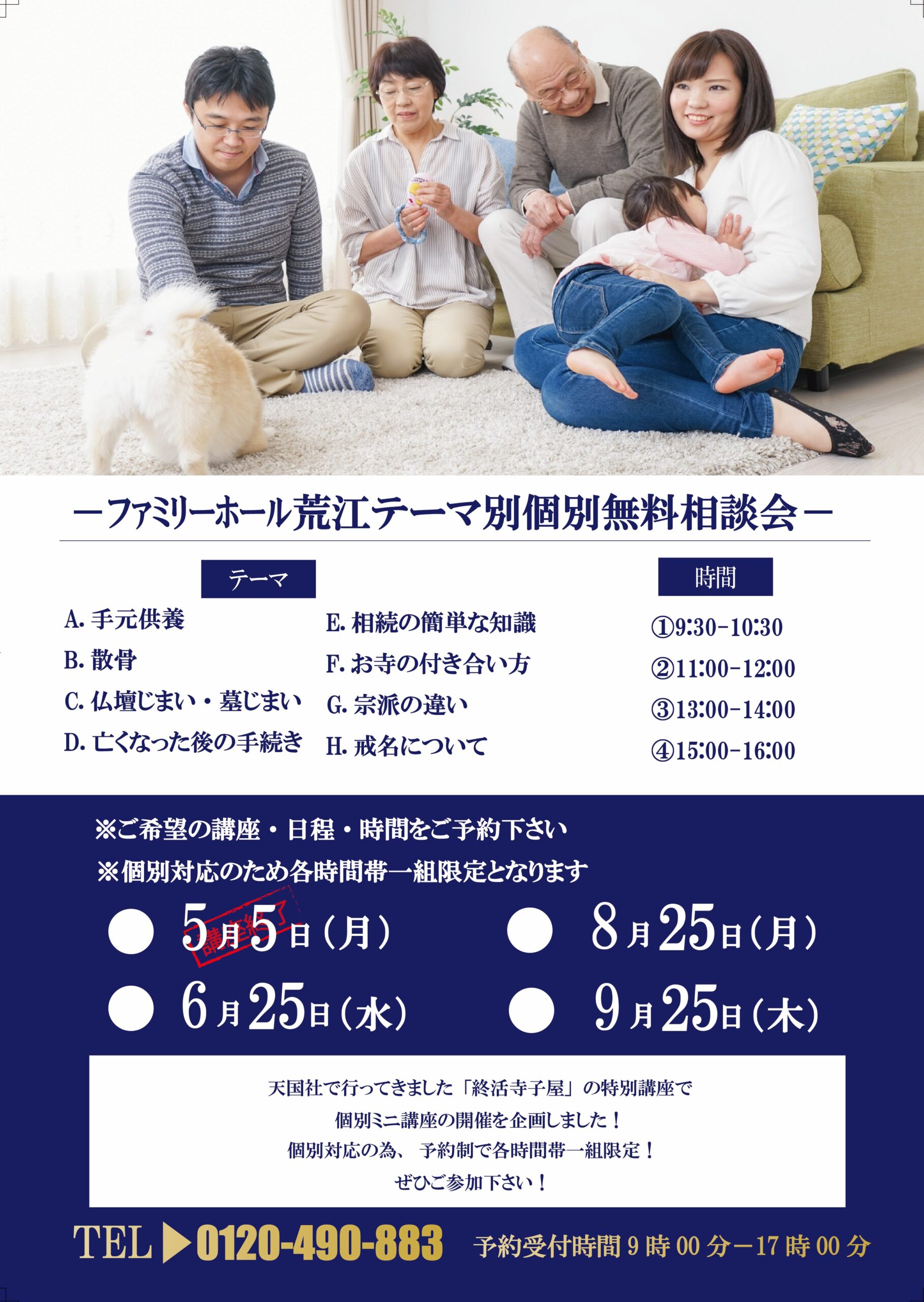天国社からのお知らせ 福岡の葬儀社「天国社」 天国社からのお知らせ お知らせ テーマ別個別無料相談会inファミリーホール荒江 テーマ別個別無料相談会inファミリーホール荒江 2025.05.25 お知らせ 天国社で今まで行ってきた「終活寺子屋」の特別講座!! なんと今回個別ミニ講座の開催が決定致しました。 場所は天国社ファミリーホール荒江で行います! ※予約時、下記からご希望の講座・日程・時間をお申しつけください。 テーマ A 手元供養 B散骨 C仏壇じまい D亡くなった後の手続き E相続の簡単な知識 Fお寺の付合い方 G宗派の違い H戒名について 日にち 6月25日(水) 8月25日(月) 9月25日(木) 時間 ①9時30分~10時30分 ②11時00分~12時00分 ③13時00分~14時00分 ④15時00分~16時00分 個別対応の対応、予約制で各時間帯一組限定なのでご予約はお早めに! 予約受付時間:9時~17時 些細と思われる事も、お気軽にご連絡ください。 24時間365日対応・通話無料 電話をかける メールでご相談 無料資料請求 戻る カテゴリー 新着情報 お知らせ イベント情報 葬儀の知識 福岡の葬儀情報 家族葬について お客様の声 ご葬儀事例一覧 年別アーカイブ 2025年 2024年
