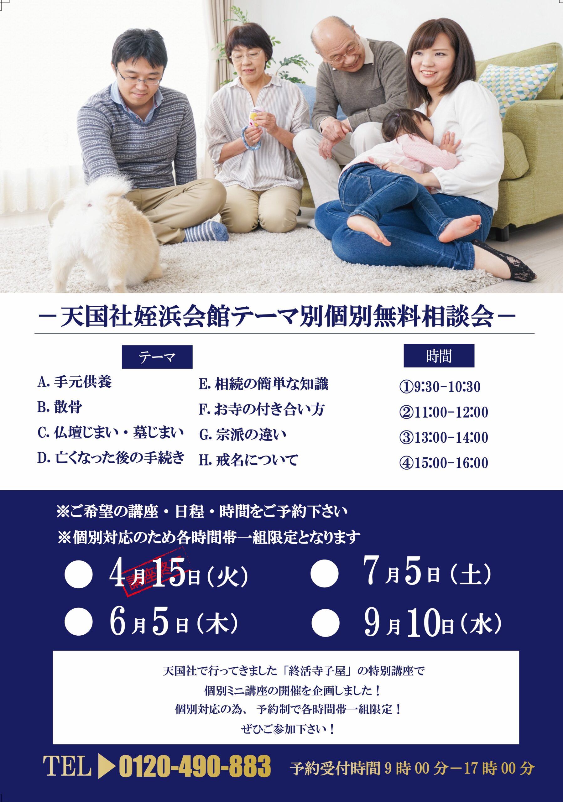 天国社からのお知らせ 福岡の葬儀社「天国社」 天国社からのお知らせ お知らせ テーマ別個別無料相談会in天国社姪浜会館 テーマ別個別無料相談会in天国社姪浜会館 2025.05.05 お知らせ 天国社で今まで行ってきた「終活寺子屋」の特別講座!! なんと今回個別ミニ講座の開催が決定致しました。 場所は天国社姪浜会館で行います! ※予約時、下記からご希望の講座・日程・時間をお申しつけください。 テーマ A 手元供養 B散骨 C仏壇じまい・墓じまい D亡くなった後の手続き E相続の簡単な知識 Fお寺の付合い方 G宗派の違い H戒名について 日にち 6月5日(木) 7月5日(土) 9月10日(水) 時間 ①9時30分~10時30分 ②11時00分~12時00分 ③13時00分~14時00分 ④15時00分~16時00分 個別対応の対応、予約制で各時間帯一組限定なのでご予約はお早めに! 予約受付時間:9時~17時 些細と思われる事も、お気軽にご連絡ください。 24時間365日対応・通話無料 電話をかける メールでご相談 無料資料請求 戻る カテゴリー 新着情報 お知らせ イベント情報 葬儀の知識 福岡の葬儀情報 家族葬について お客様の声 ご葬儀事例一覧 年別アーカイブ 2025年 2024年