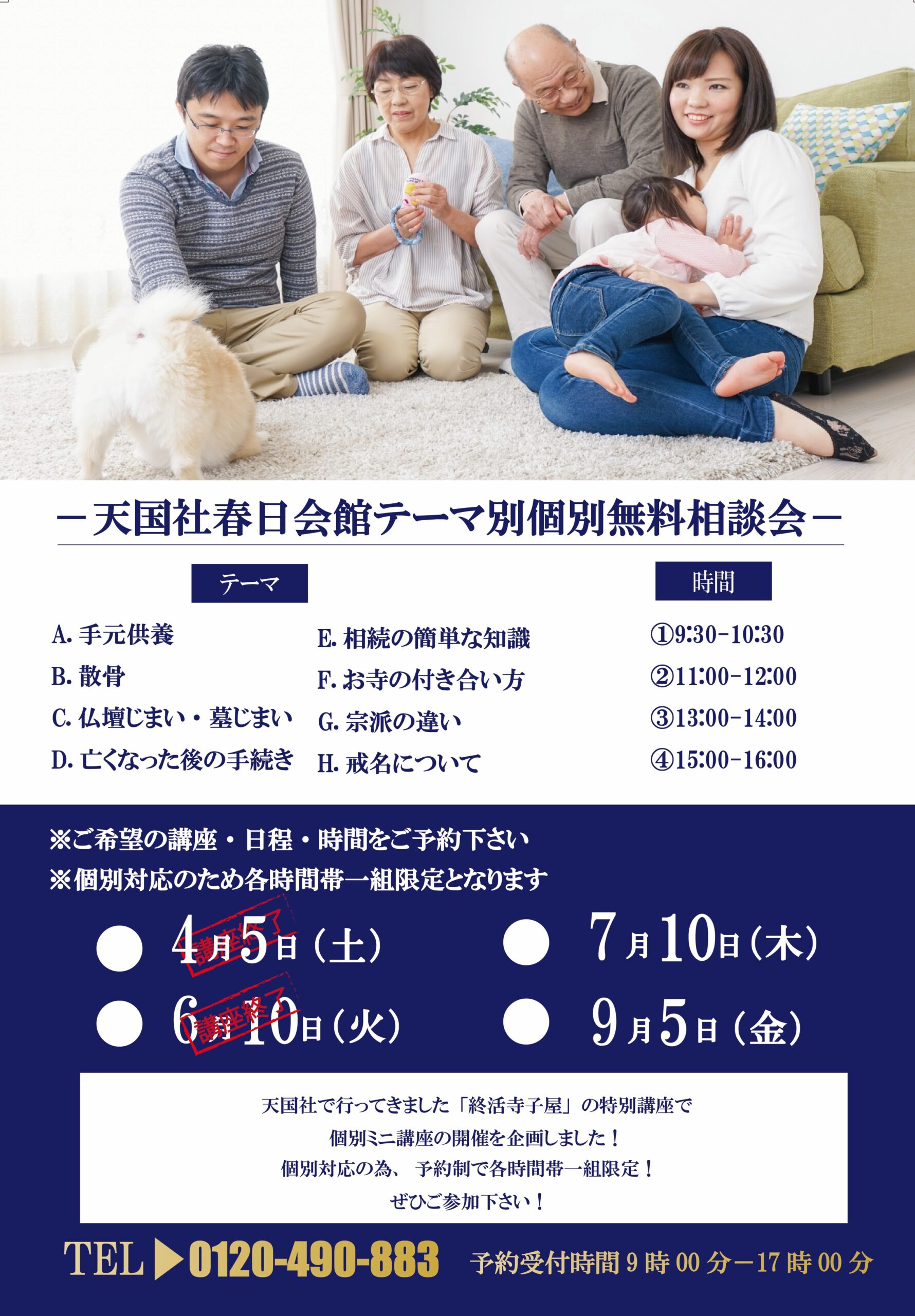天国社からのお知らせ 福岡の葬儀社「天国社」 天国社からのお知らせ お知らせ テーマ別個別無料相談会in天国社春日会館 テーマ別個別無料相談会in天国社春日会館 2025.06.10 お知らせ 天国社で今まで行ってきた「終活寺子屋」の特別講座!! なんと今回個別ミニ講座の開催が決定致しました。 場所は天国社春日会館で行います! ※予約時、下記からご希望の講座・日程・時間をお申しつけください。 テーマ A 手元供養 B散骨 C仏壇じまい・墓じまい D亡くなった後の手続き E相続の簡単な知識 Fお寺の付合い方 G宗派の違い H戒名について 日にち 7月10日(木) 9月5日(金) 時間 ①9時30分~10時30分 ②11時00分~12時00分 ③13時00分~14時00分 ④15時00分~16時00分 個別対応の対応、予約制で各時間帯一組限定なのでご予約はお早めに! 予約受付時間:9時~17時 些細と思われる事も、お気軽にご連絡ください。 24時間365日対応・通話無料 電話をかける メールでご相談 無料資料請求 戻る カテゴリー 新着情報 お知らせ イベント情報 葬儀の知識 福岡の葬儀情報 家族葬について お客様の声 ご葬儀事例一覧 年別アーカイブ 2025年 2024年