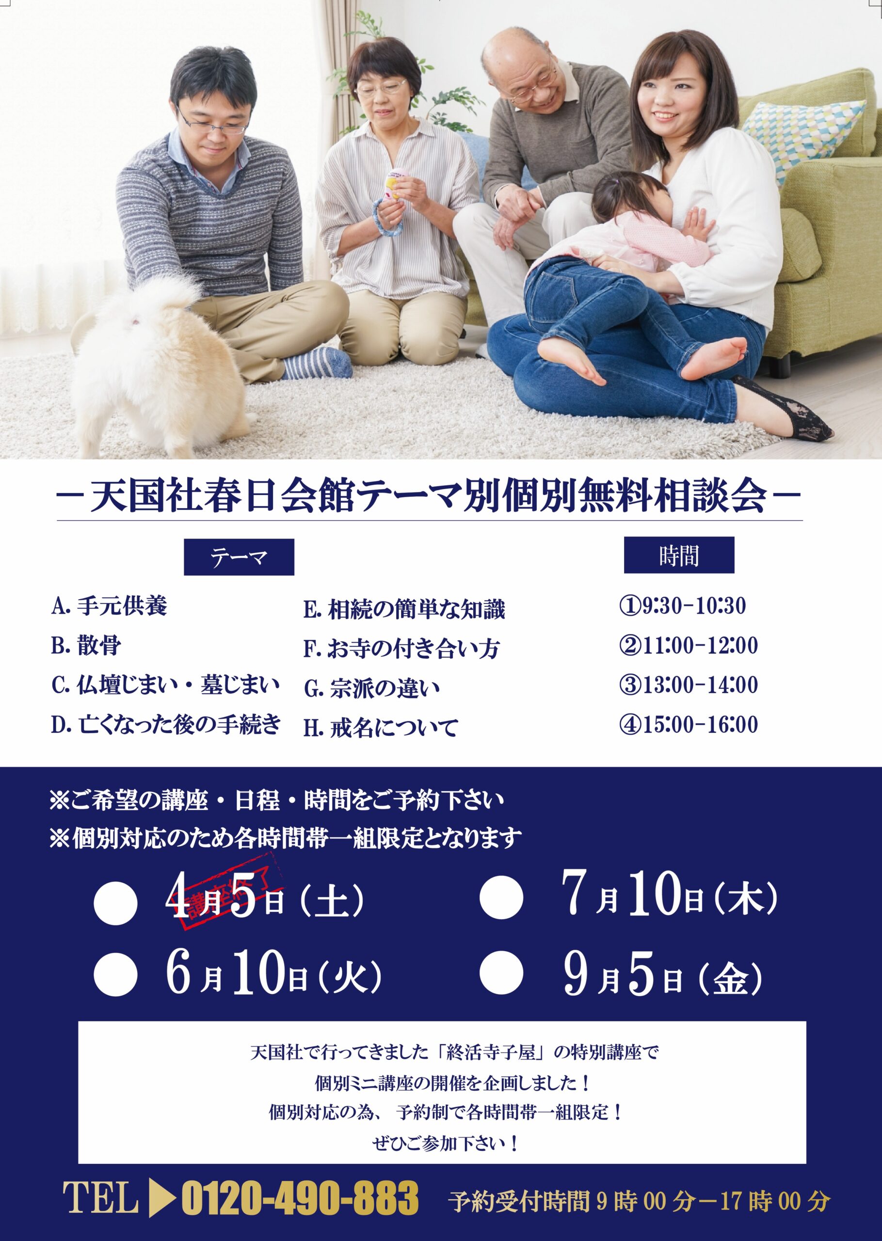 天国社からのお知らせ 福岡の葬儀社「天国社」 天国社からのお知らせ お知らせ テーマ別個別無料相談会in天国社春日会館 テーマ別個別無料相談会in天国社春日会館 2025.05.10 お知らせ 天国社で今まで行ってきた「終活寺子屋」の特別講座!! なんと今回個別ミニ講座の開催が決定致しました。 場所は天国社春日会館で行います! ※予約時、下記からご希望の講座・日程・時間をお申しつけください。 テーマ A 手元供養 B散骨 C仏壇じまい D亡くなった後の手続き E相続の簡単な知識 Fお寺の付合い方 G宗派の違い H戒名について 日にち 6月10日(火) 7月10日(水) 9月5日(金) 時間 ①9時30分~10時30分 ②11時00分~12時00分 ③13時00分~14時00分 ④15時00分~16時00分 個別対応の対応、予約制で各時間帯一組限定なのでご予約はお早めに! 予約受付時間:9時~17時 些細と思われる事も、お気軽にご連絡ください。 24時間365日対応・通話無料 電話をかける メールでご相談 無料資料請求 戻る カテゴリー 新着情報 お知らせ イベント情報 葬儀の知識 福岡の葬儀情報 家族葬について お客様の声 ご葬儀事例一覧 年別アーカイブ 2025年 2024年