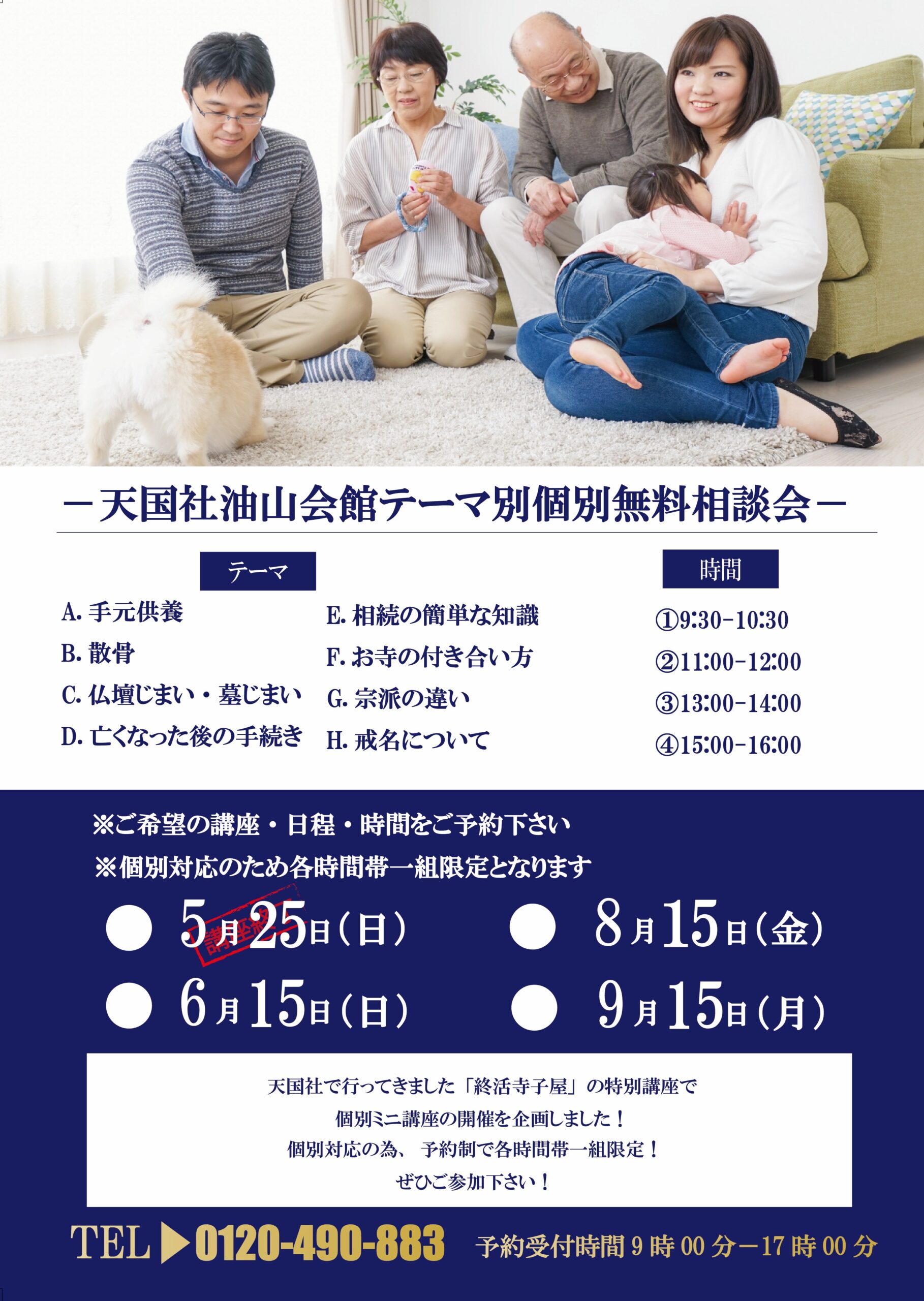 天国社からのお知らせ 福岡の葬儀社「天国社」 天国社からのお知らせ お知らせ テーマ別個別無料相談会in天国社油山会館 テーマ別個別無料相談会in天国社油山会館 2025.05.15 お知らせ 天国社で今まで行ってきた「終活寺子屋」の特別講座!! なんと今回個別ミニ講座の開催が決定致しました。 場所は天国社油山会館で行います! ※予約時、下記からご希望の講座・日程・時間をお申しつけください。 テーマ A 手元供養 B散骨 C仏壇じまい・墓じまい D亡くなった後の手続き E相続の簡単な知識 Fお寺の付合い方 G宗派の違い H戒名について 日にち 6月15日(日) 8月15日(金) 9月15日(月) 時間 ①9時30分~10時30分 ②11時00分~12時00分 ③13時00分~14時00分 ④15時00分~16時00分 個別対応の対応、予約制で各時間帯一組限定なのでご予約はお早めに! 予約受付時間:9時~17時 些細と思われる事も、お気軽にご連絡ください。 24時間365日対応・通話無料 電話をかける メールでご相談 無料資料請求 戻る カテゴリー 新着情報 お知らせ イベント情報 葬儀の知識 福岡の葬儀情報 家族葬について お客様の声 ご葬儀事例一覧 年別アーカイブ 2025年 2024年