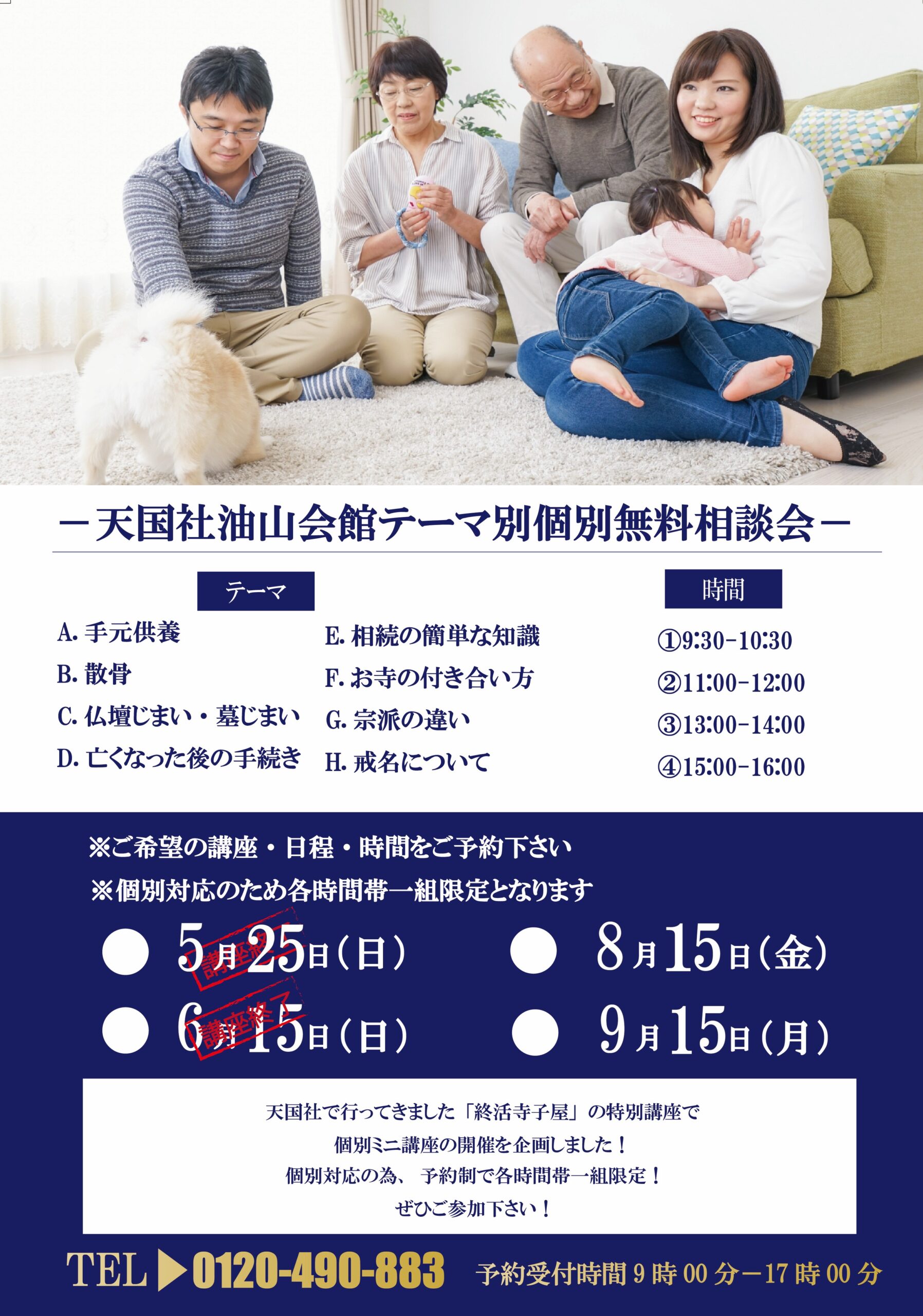 天国社からのお知らせ 福岡の葬儀社「天国社」 天国社からのお知らせ お知らせ テーマ別個別無料相談会in天国社油山会館 テーマ別個別無料相談会in天国社油山会館 2025.07.15 お知らせ 天国社で今まで行ってきた「終活寺子屋」の特別講座!! なんと今回個別ミニ講座の開催が決定致しました。 場所は天国社油山会館で行います! ※予約時、下記からご希望の講座・日程・時間をお申しつけください。 テーマ A 手元供養 B散骨 C仏壇じまい・墓じまい D亡くなった後の手続き E相続の簡単な知識 Fお寺の付合い方 G宗派の違い H戒名について 日にち 8月15日(金) 9月15日(月) 時間 ①9時30分~10時30分 ②11時00分~12時00分 ③13時00分~14時00分 ④15時00分~16時00分 個別対応の対応、予約制で各時間帯一組限定なのでご予約はお早めに! 予約受付時間:9時~17時 些細と思われる事も、お気軽にご連絡ください。 24時間365日対応・通話無料 電話をかける メールでご相談 無料資料請求 戻る カテゴリー 新着情報 お知らせ イベント情報 葬儀の知識 福岡の葬儀情報 家族葬について お客様の声 ご葬儀事例一覧 年別アーカイブ 2025年 2024年