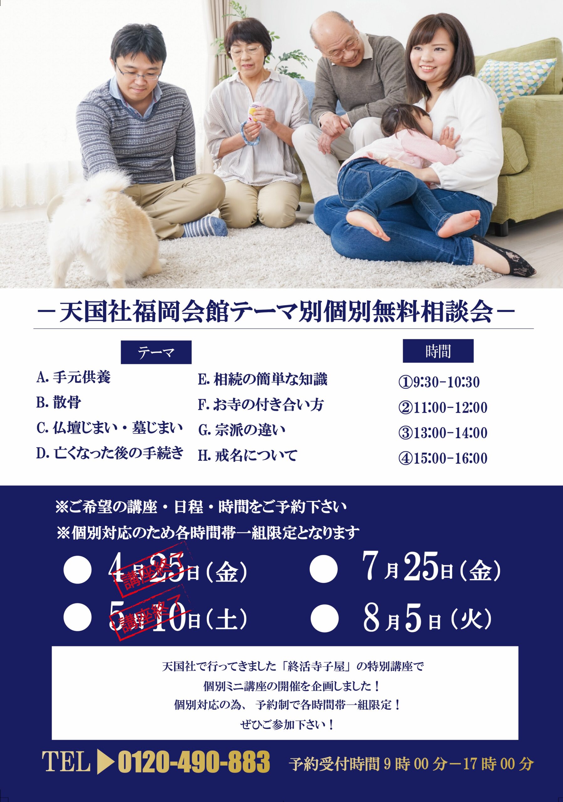 天国社からのお知らせ 福岡の葬儀社「天国社」 天国社からのお知らせ お知らせ テーマ別個別無料相談会in天国社福岡会館 テーマ別個別無料相談会in天国社福岡会館 2025.06.25 お知らせ 天国社で今まで行ってきた「終活寺子屋」の特別講座!! なんと今回個別ミニ講座の開催が決定致しました。 場所は天国社福岡会館で行います! ※予約時、下記からご希望の講座・日程・時間をお申しつけください。 テーマ A 手元供養 B散骨 C仏壇じまい・墓じまい D亡くなった後の手続き E相続の簡単な知識 Fお寺の付合い方 G宗派の違い H戒名について 日にち 7月25日(金) 8月5日(火) 時間 ①9時30分~10時30分 ②11時00分~12時00分 ③13時00分~14時00分 ④15時00分~16時00分 個別対応の対応、予約制で各時間帯一組限定なのでご予約はお早めに! 予約受付時間:9時~17時 些細と思われる事も、お気軽にご連絡ください。 24時間365日対応・通話無料 電話をかける メールでご相談 無料資料請求 戻る カテゴリー 新着情報 お知らせ イベント情報 葬儀の知識 福岡の葬儀情報 家族葬について お客様の声 ご葬儀事例一覧 年別アーカイブ 2025年 2024年