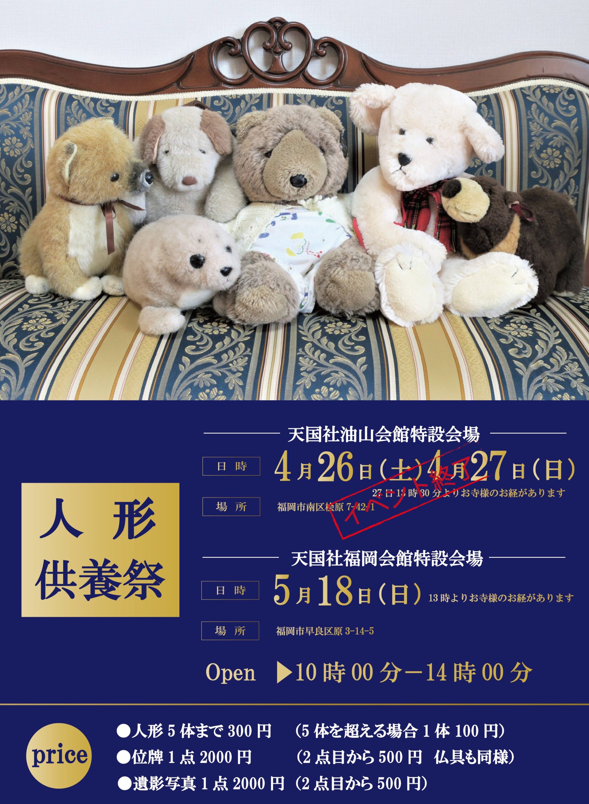 天国社からのお知らせ 福岡の葬儀社「天国社」 天国社からのお知らせ お知らせ 人形供養祭in天国社福岡会館特設会場 人形供養祭in天国社福岡会館特設会場 2025.05.06 お知らせ 先日、多くの方にご参加いただきました人形供養祭in油山会館 今回は、会場を天国社福岡会館にうつして 「人形供養祭in天国社福岡会館」を開催致します。 場所 天国社福岡会館 日程 5月18日(日) 時間 10時~14時 ※13時よりお寺様のお経があります 料金案内 ・人形5体まで300円 ※5体を超える場合、1本100円 ・位牌1点2,000円 ※2点目からは500円(仏具も同様) ・遺影写真1点2,000円 ※2点目から500円 些細と思われる事も、お気軽にご連絡ください。 24時間365日対応・通話無料 電話をかける メールでご相談 無料資料請求 戻る カテゴリー 新着情報 お知らせ イベント情報 葬儀の知識 福岡の葬儀情報 家族葬について お客様の声 ご葬儀事例一覧 年別アーカイブ 2025年 2024年