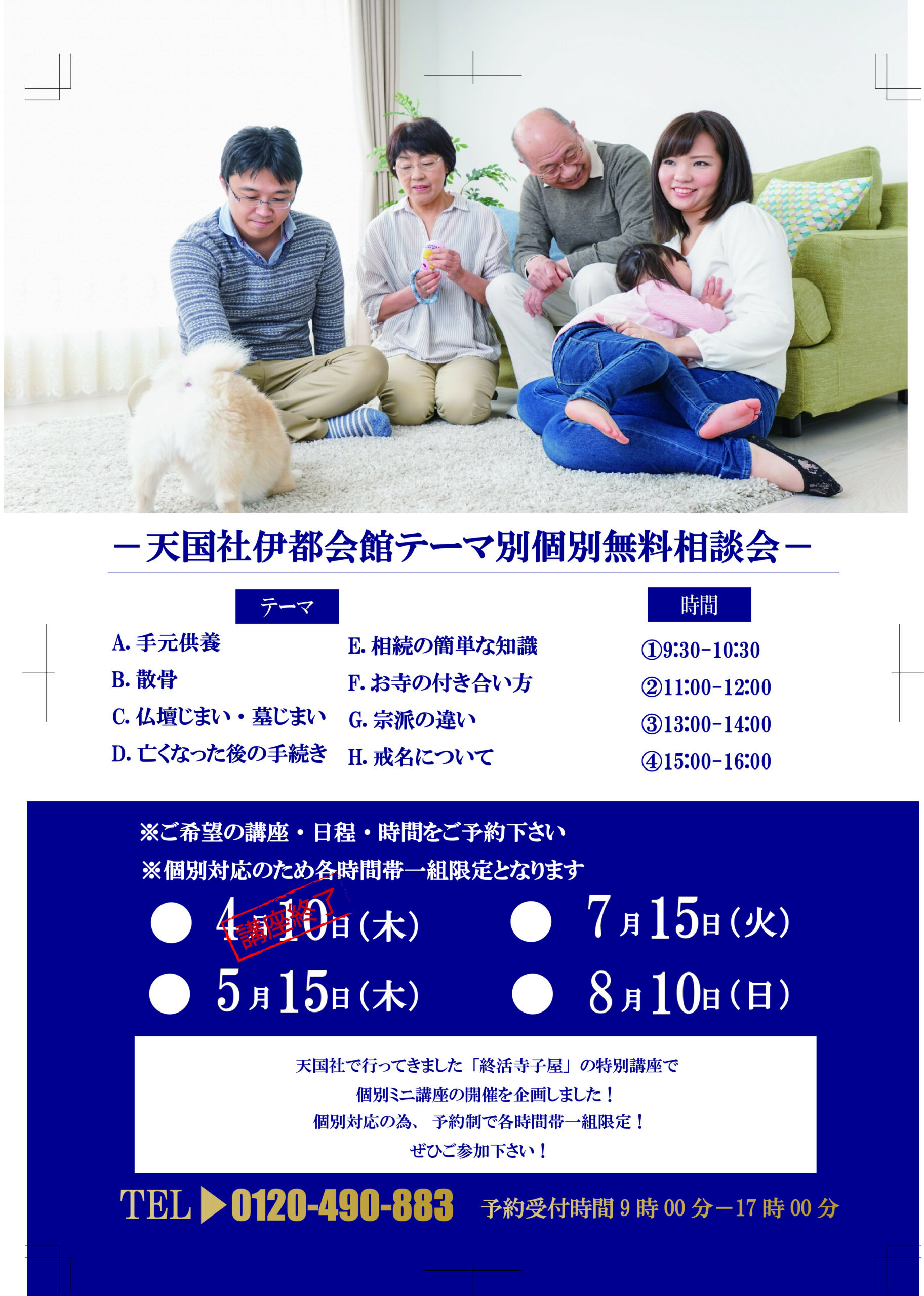天国社からのお知らせ 福岡の葬儀社「天国社」 天国社からのお知らせ お知らせ テーマ別個別無料相談会in天国社伊都会館 テーマ別個別無料相談会in天国社伊都会館 2025.05.06 お知らせ 天国社で今まで行ってきた「終活寺子屋」の特別講座!! なんと今回個別ミニ講座の開催が決定致しました。 場所は天国社伊都会館で行います! 天国社で今まで行ってきた「終活寺子屋」の特別講座!! なんと今回個別ミニ講座の開催が決定致しました。 場所は天国社伊都会館で行います! テーマ A 手元供養 B散骨 C仏壇じまい・墓じまい D亡くなった後の手続き E相続の簡単な知識 Fお寺の付合い方 G宗派の違い H戒名について 日にち 5月15日(木) 7月15日(火) 8月10日(日) 時間 ①9時30分~10時30分 ②11時00分~12時00分 ③13時00分~14時00分 ④15時00分~16時00分 個別対応の対応、予約制で各時間帯一組限定なのでご予約はお早めに! 予約受付時間:9時~17時 些細と思われる事も、お気軽にご連絡ください。 24時間365日対応・通話無料 電話をかける メールでご相談 無料資料請求 戻る カテゴリー 新着情報 お知らせ イベント情報 葬儀の知識 福岡の葬儀情報 家族葬について お客様の声 ご葬儀事例一覧 年別アーカイブ 2025年 2024年