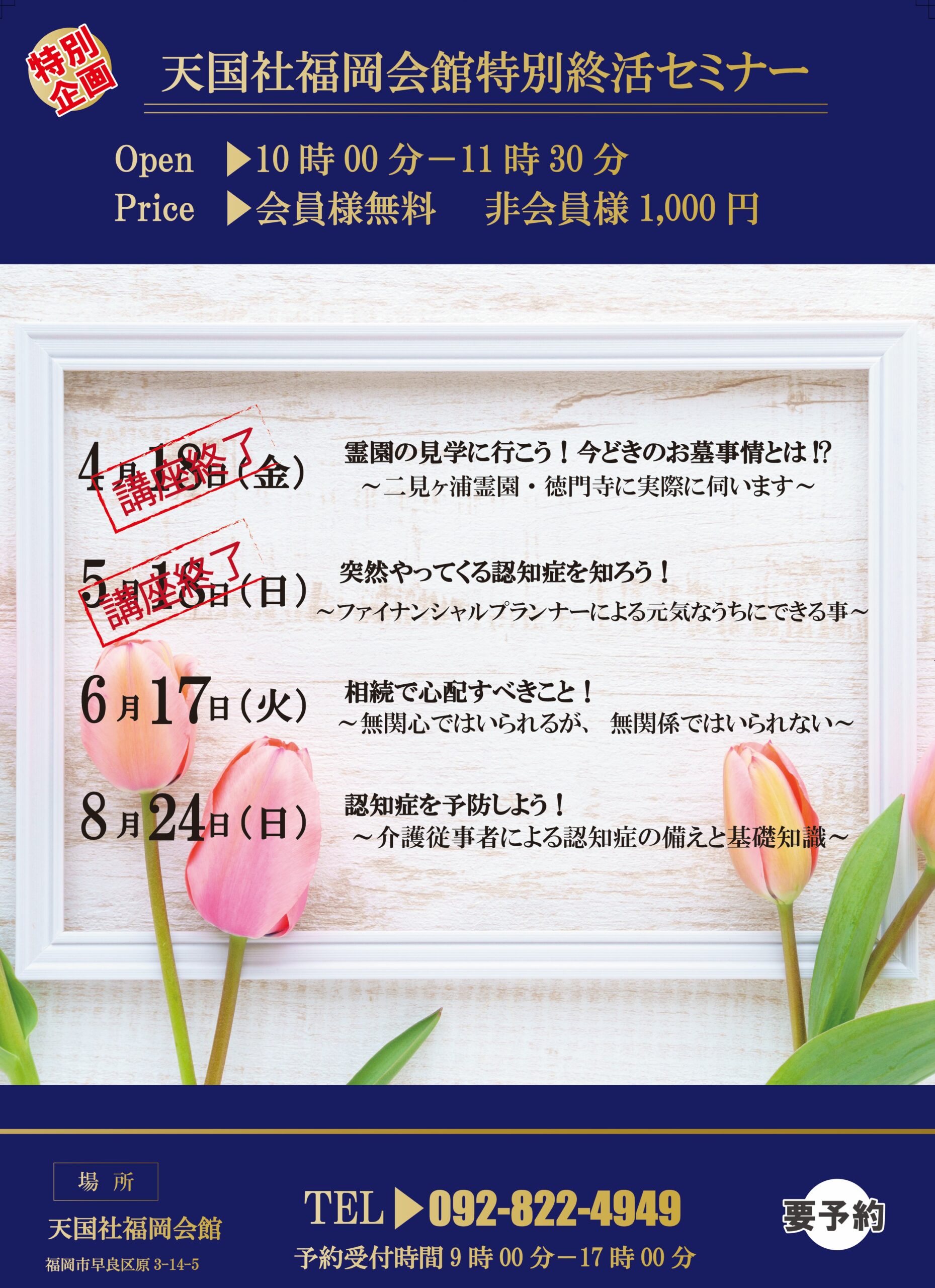 天国社からのお知らせ 福岡の葬儀社「天国社」 天国社からのお知らせ お知らせ 天国社福岡会館特別終活セミナー 天国社福岡会館特別終活セミナー 2025.05.17 お知らせ 天国社福岡会館で下記 日程・時間において「特別終活セミナー」を行います。 日程&タイトル ※日にちにより開催テーマが異なりますのでご注意ください。 ◎6月17日(火) 相続で心配すべきこと! ~無関心ではいられるが、無関係ではいられない~ ◎8月24日(日) 認知症を予防しよう! ~介護従事者による認知症の備えと基礎知識~ 時間 10時~11時30分 料金 会員様:無料 非会員様:1,000円 予約受付時間9時~17時 些細と思われる事も、お気軽にご連絡ください。 24時間365日対応・通話無料 電話をかける メールでご相談 無料資料請求 戻る カテゴリー 新着情報 お知らせ イベント情報 葬儀の知識 福岡の葬儀情報 家族葬について お客様の声 ご葬儀事例一覧 年別アーカイブ 2025年 2024年