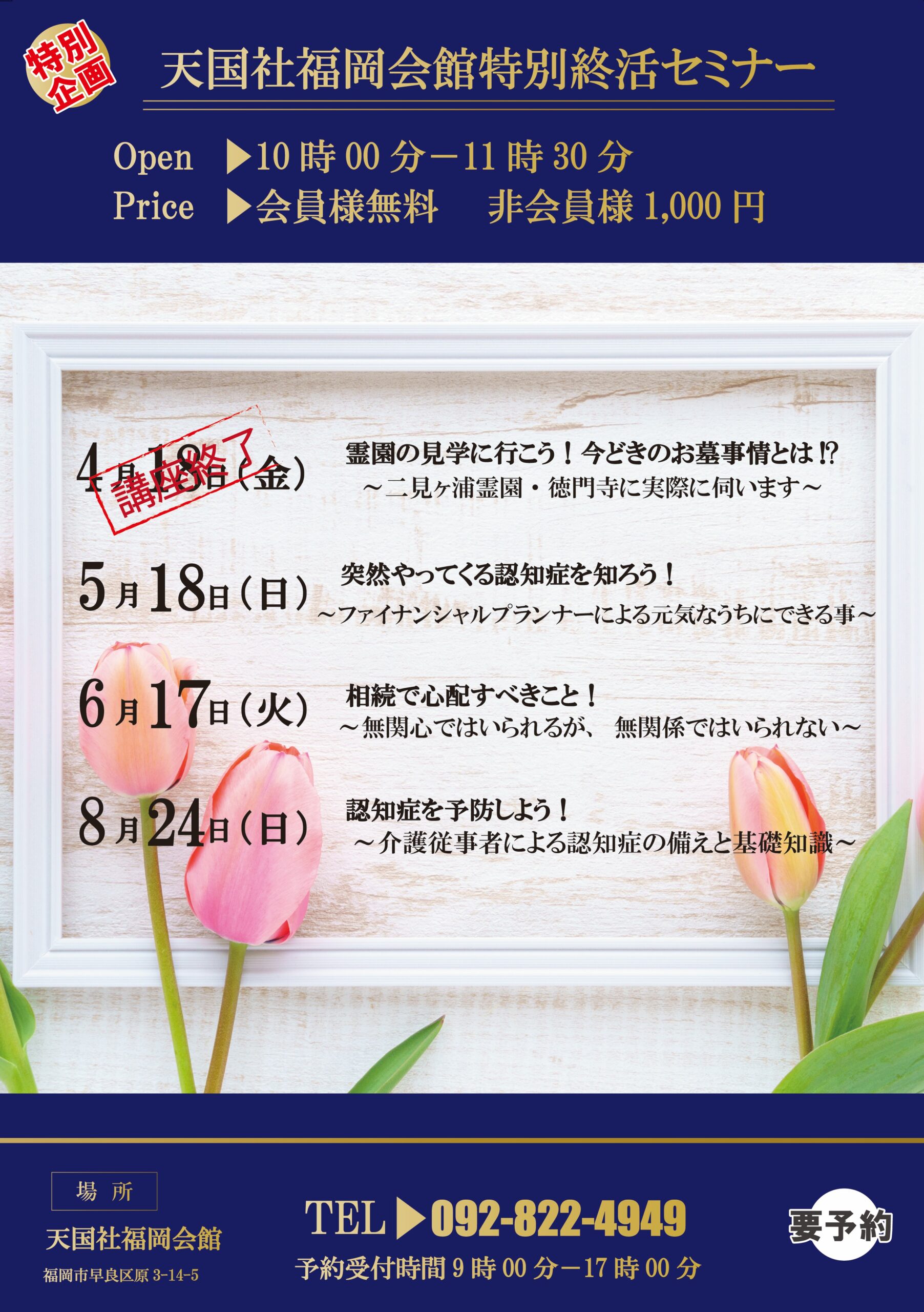 天国社からのお知らせ 福岡の葬儀社「天国社」 天国社からのお知らせ お知らせ 天国社福岡会館特別終活セミナー 天国社福岡会館特別終活セミナー 2025.05.07 お知らせ 天国社福岡会館で下記 日程・時間において「特別終活セミナー」を行います。 日程&タイトル ※日にちにより開催テーマが異なりますのでご注意ください。 ◎5月18日(日) 突然やってくる認知症を知ろう! ~ファイナンシャルプランナーによる元気なうちにできる事~ ◎6月17日(火) 相続で心配すべきこと! ~無関心ではいられるが、無関係ではいられない~ ◎8月24日(日) 認知症を予防しよう! ~介護従事者による認知症の備えと基礎知識~ 時間 10時~11時30分 料金 会員様:無料 非会員様:1,000円 予約受付時間9時~17時 些細と思われる事も、お気軽にご連絡ください。 24時間365日対応・通話無料 電話をかける メールでご相談 無料資料請求 戻る カテゴリー 新着情報 お知らせ イベント情報 葬儀の知識 福岡の葬儀情報 家族葬について お客様の声 ご葬儀事例一覧 年別アーカイブ 2025年 2024年