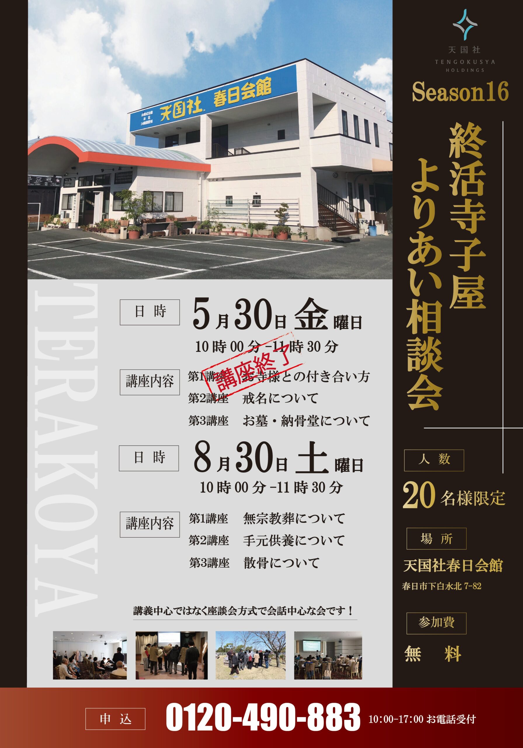 天国社からのお知らせ 福岡の葬儀社「天国社」 天国社からのお知らせ お知らせ 終活寺子屋よりあい相談会in天国社春日会館 終活寺子屋よりあい相談会in天国社春日会館 2025.07.30 お知らせ 8月30日 土曜日 天国社春日会館において 終活寺子屋よりあい相談会を開催致します。 講義中心ではなく、座談会方式で会話中心な相談会となっております。 なんと参加費は無料です! 皆様これを機会にぜひ、気楽にご参加ください。 ・第一講座 無宗教葬について ・第二講座 手元供養について ・第三講座 散骨について ・開催場所:天国社春日会館・日にち:8月30日(土曜日)・時間:10時~11時30分・参加費:無料 些細と思われる事も、お気軽にご連絡ください。 24時間365日対応・通話無料 電話をかける メールでご相談 無料資料請求 戻る カテゴリー 新着情報 お知らせ イベント情報 葬儀の知識 福岡の葬儀情報 家族葬について お客様の声 ご葬儀事例一覧 年別アーカイブ 2025年 2024年