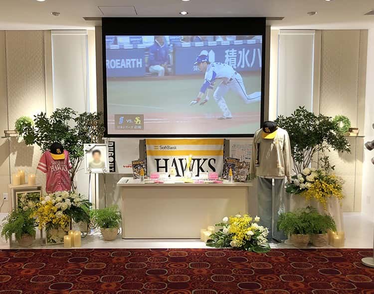 葬儀プラン家族葬(参列者10名~20名のお葬儀) 福岡の葬儀社「天国社」 お客様の声ご葬儀事例一覧 葬儀プラン家族葬(参列者10名~20名のお葬儀) 参列者10名~20名のお葬儀 葬儀プラン:家族葬 式場:姪浜会館 人数:10~20人 ご家族のご要望 故人がソフトバンクホークスの大ファンだったから、何かしらの形にしたい 担当者からのコメント ソフトバンクホークスの大ファンだった故人様・・ 何かしらの形にしたいとの言葉を頂き、ソフトバンクホークスのグッズや故人様が使ってらっしゃった応援グッズを飾り、モニターではソフトバンクホークスのハイライトを上映し、そこにソフトバンクホークスのカラーでもある黄色ベースの花で装飾させて頂きました。 些細と思われる事も、お気軽にご連絡ください。 24時間365日対応・通話無料 電話をかける メールでご相談 無料資料請求 戻る カテゴリー 新着情報 お知らせ イベント情報 葬儀の知識 福岡の葬儀情報 家族葬について お客様の声 ご葬儀事例一覧 年別アーカイブ 2025年 2024年